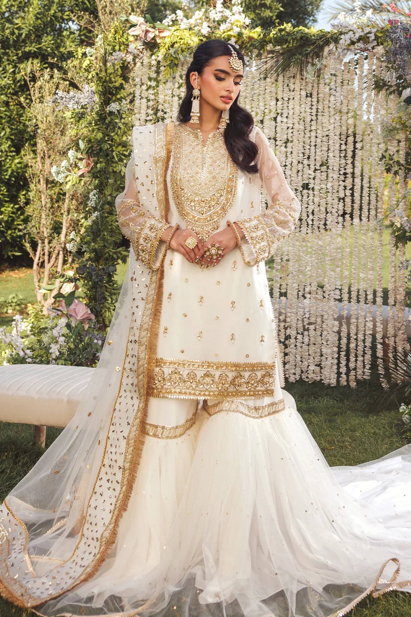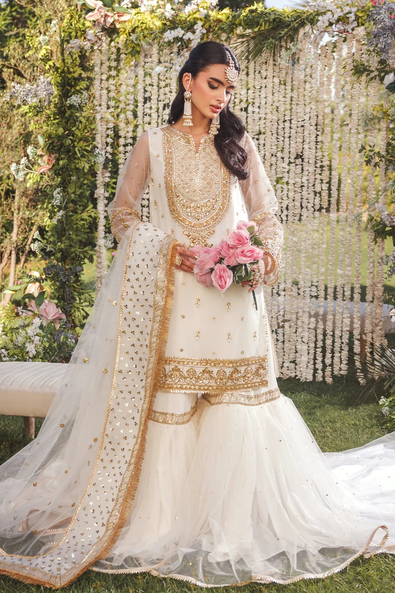 This Gharara set features an organza shirt with gota, dabka, tilla, and sequin embroidery for a luxurious look. It includes a flared gharara with hand-embellished sequins and a net dupatta finished with sequins. Perfect for nikkah ceremonies and formal events.