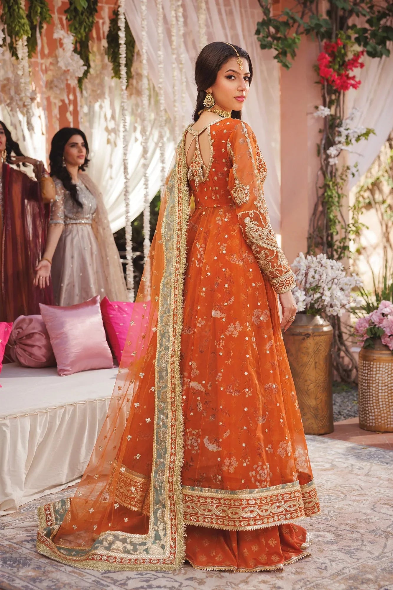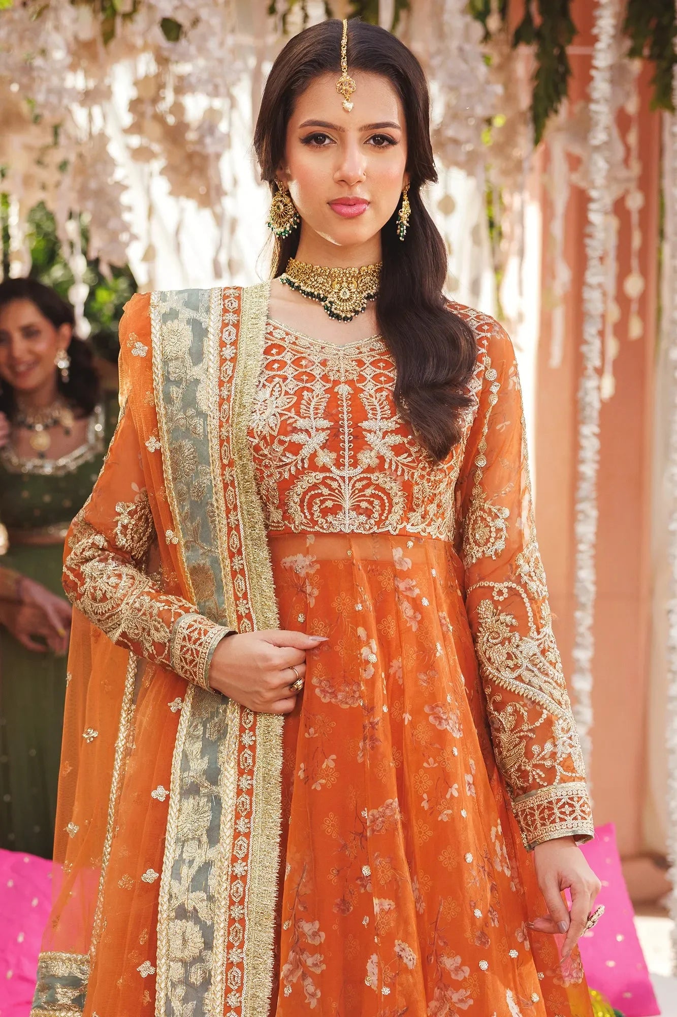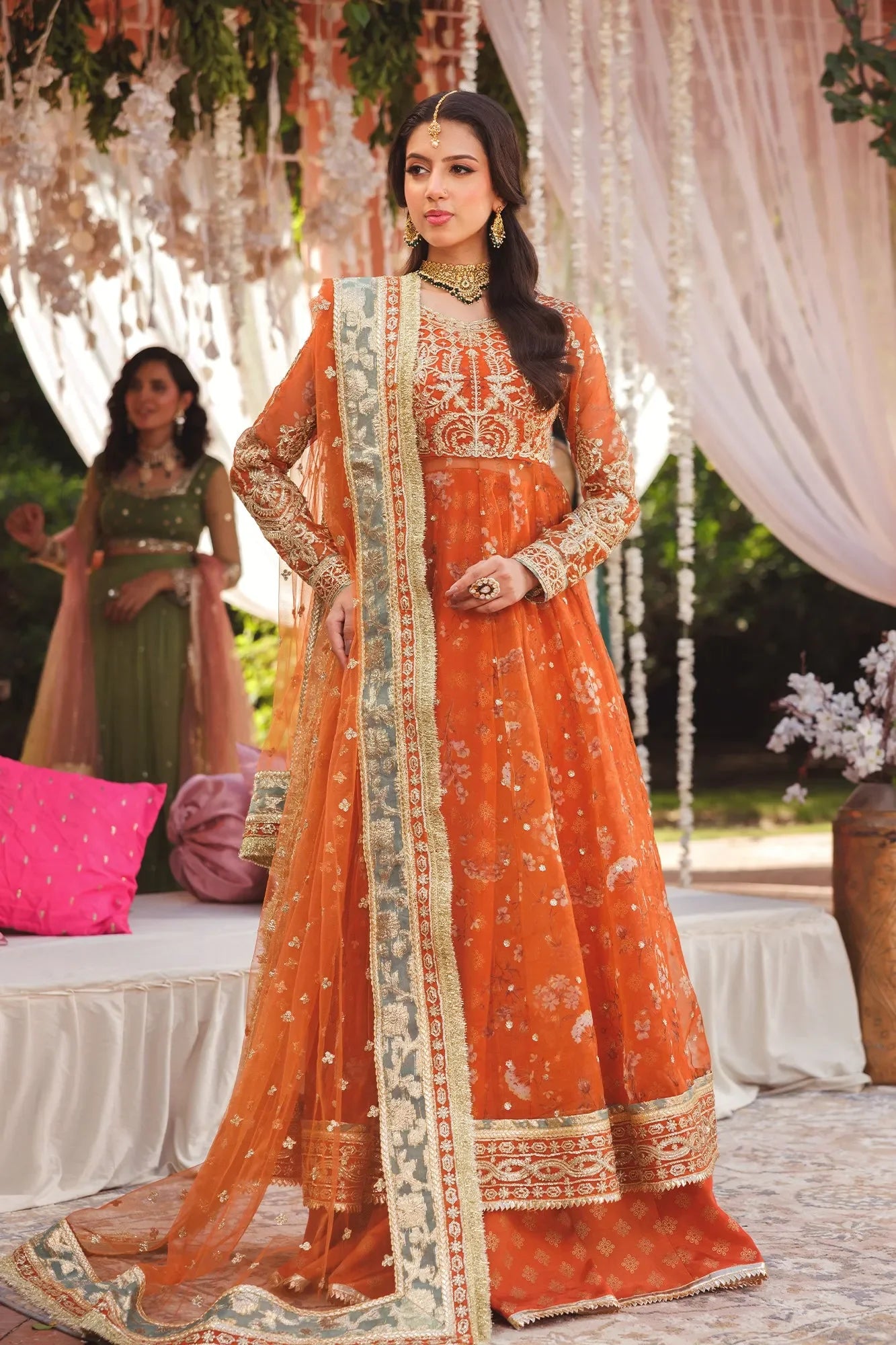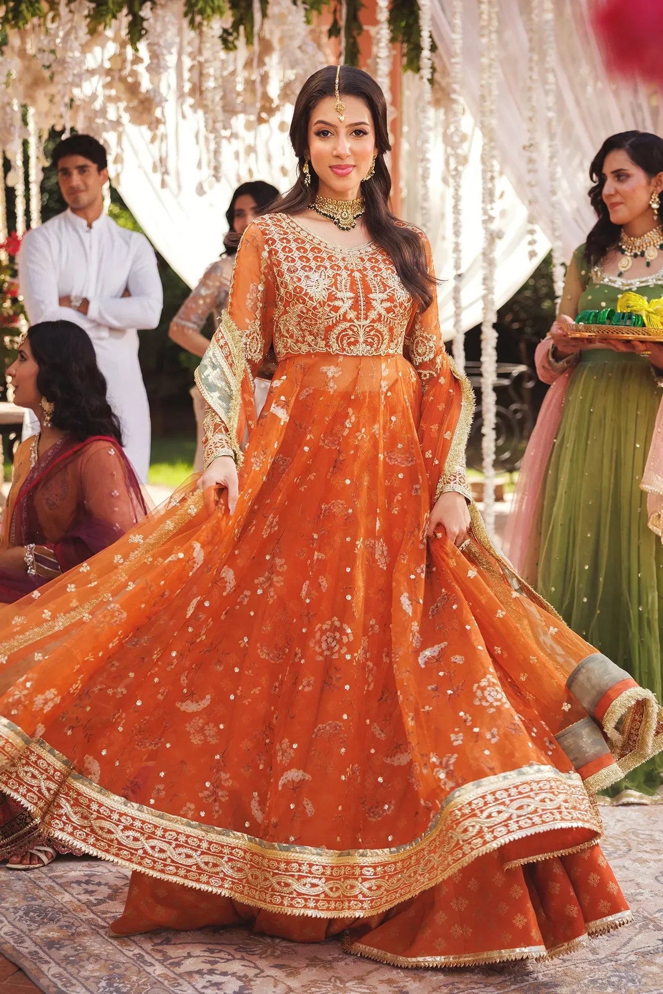 This outfit pairs a printed and embroidered organza frock with a foil-printed raw silk lehenga for a structured, festive look.A net dupatta featuring an organza zari jacquard border and kiran detailing finishes the ensemble, making it ideal for mehndi events.