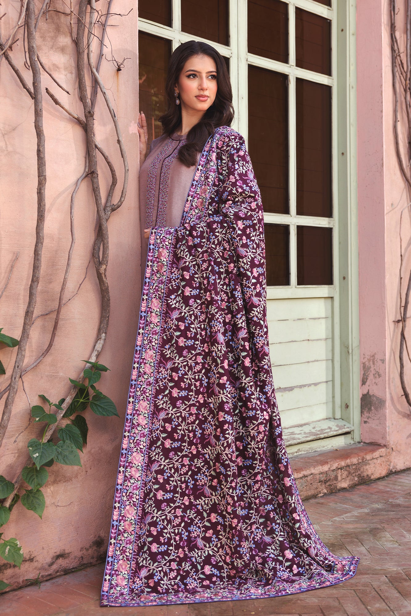 Paired with a fully embroidered shawl on peach wool, the outfit balances comfort and elegance.