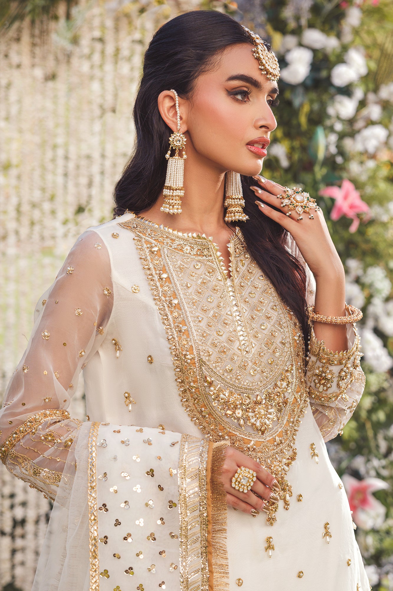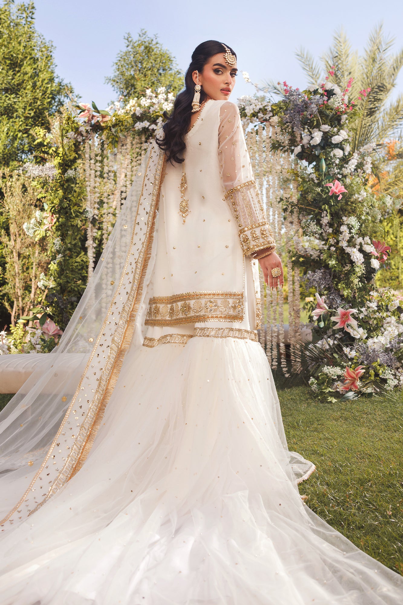 This Gharara set features an organza shirt with gota, dabka, tilla, and sequin embroidery for a luxurious look. It includes a flared gharara with hand-embellished sequins and a net dupatta finished with sequins. Perfect for nikkah ceremonies and formal events.