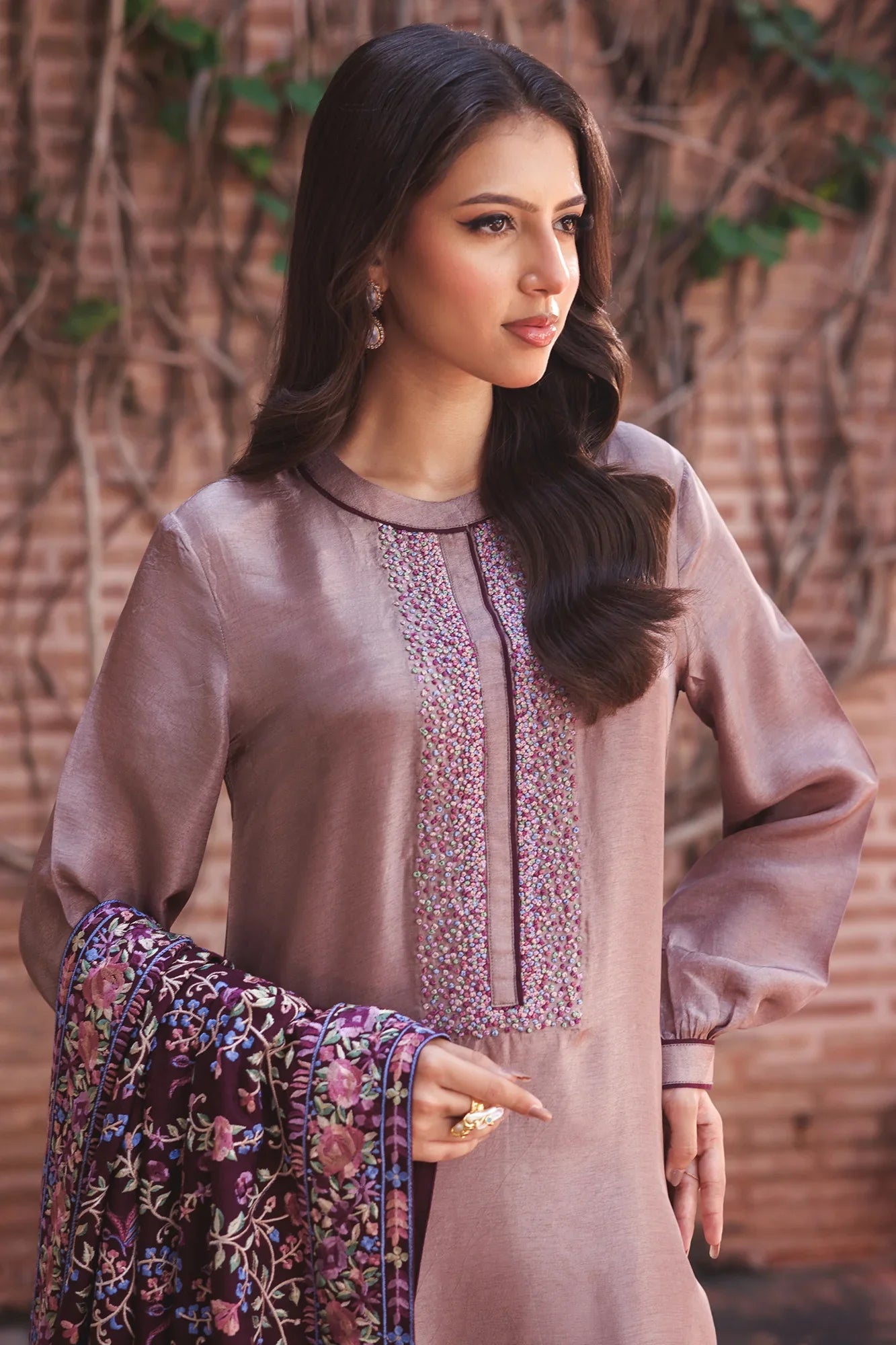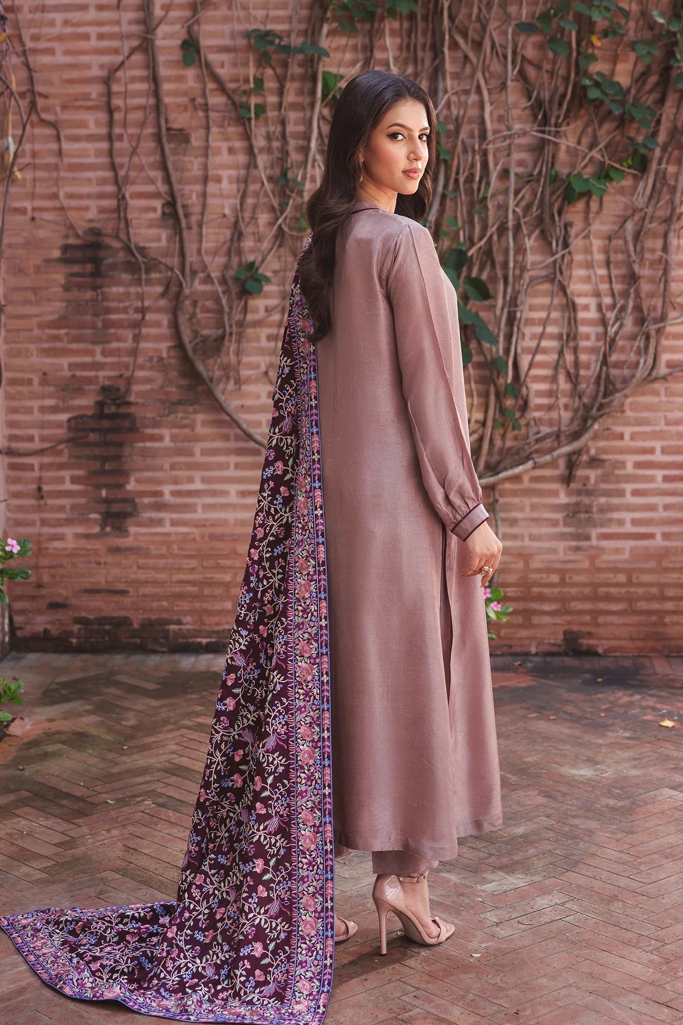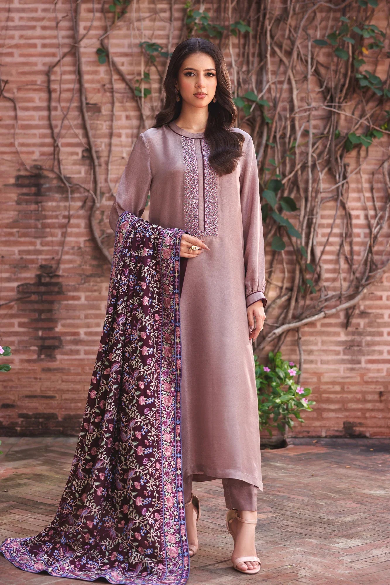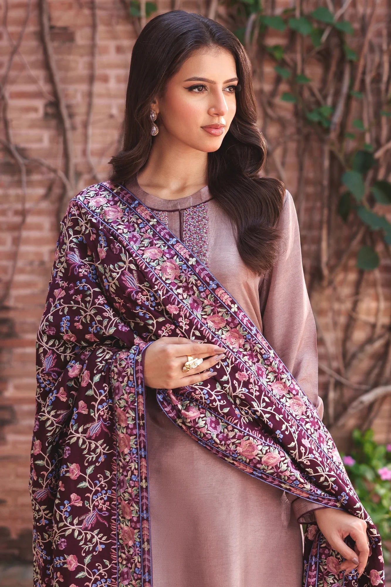 Paired with a fully embroidered shawl on peach wool, the outfit balances comfort and elegance.