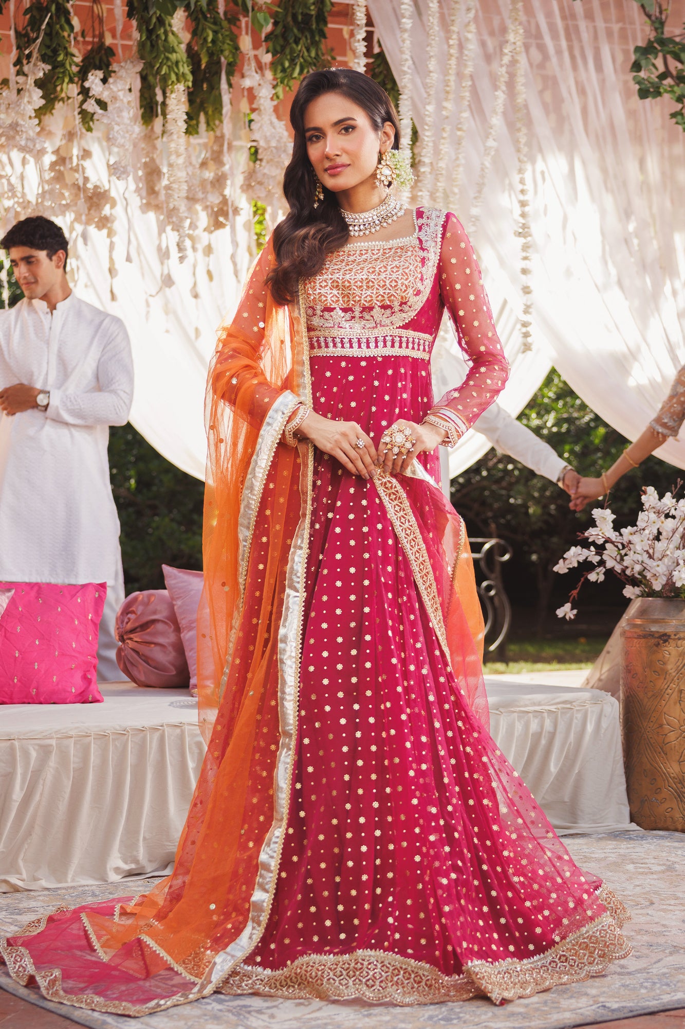 A net embroidered dupatta completes the ensemble, adding balance and softness. Ideal for formal celebrations and wedding festivities.