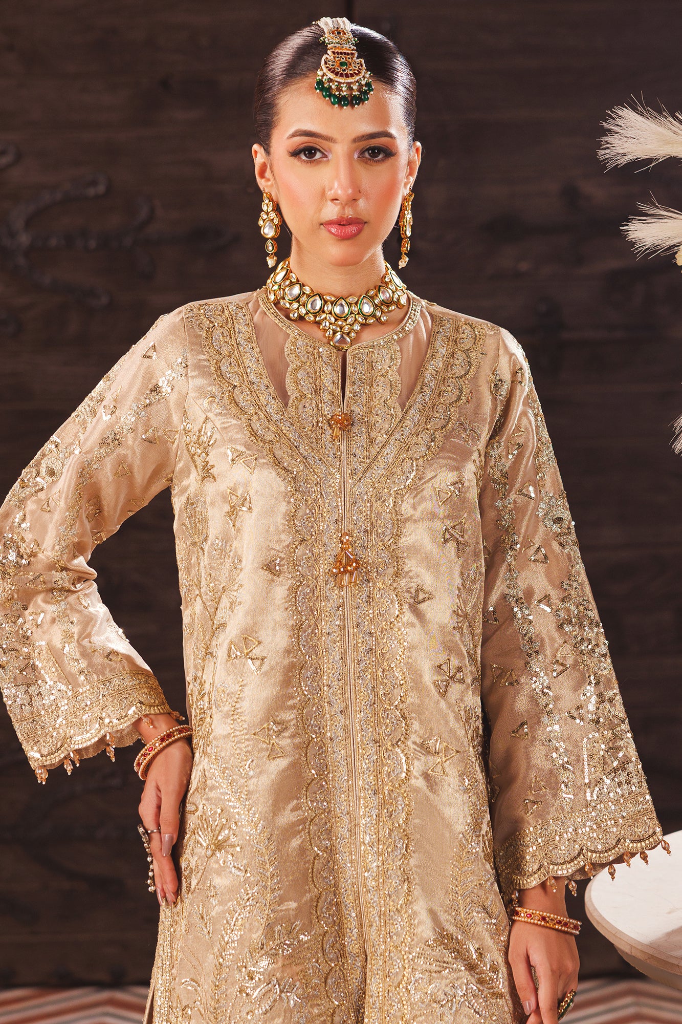 Paired with a matching tissue sharara, the ensemble flows gracefully and maintains a cohesive silhouette.