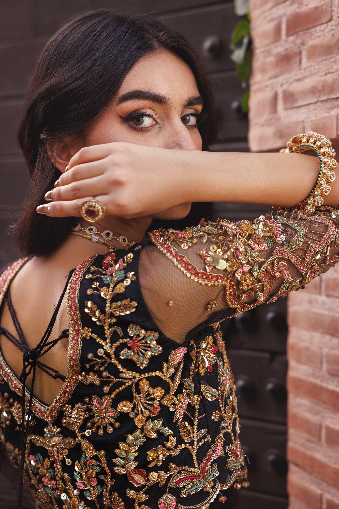 This avant-garde saree ensemble redefines contemporary luxury, merging traditional artistry with modern couture sensibility. The blouse, meticulously crafted from sheer net, features intricate hand-embroidered Resham work, delivering architectural structure and a statement-making edge.